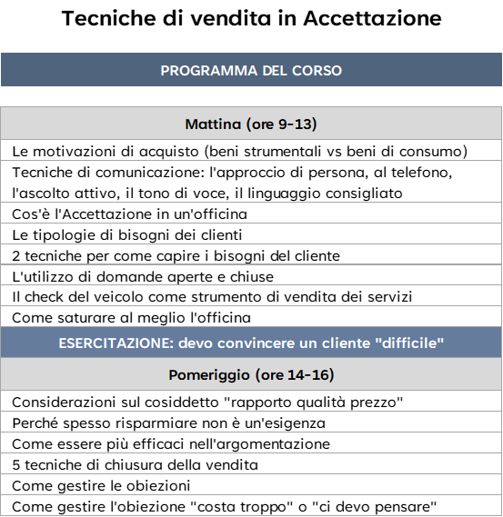 Una buona accettazione aumenta il tasso di saturazione dell’Officina e di conseguenza tutti gli aspetti ad esso connessi come redditività, il costo orario, il fatturato, la fidelizzazione del cliente, …